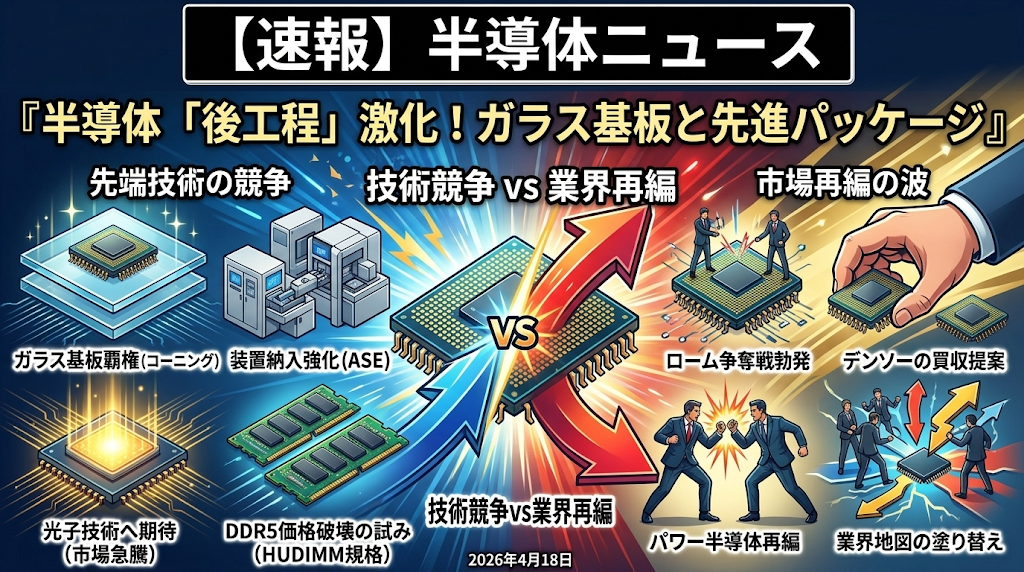 今日の半導体ニュースは、先端パッケージングや新技術の開発競争と、急速な市場再編の波が同時に押し寄せている状況をお伝えします。米コーニングがガラス基板分野で覇権を握り、ASEが先進パッケージング装置の納入を強化するなど、後工程技術の進化が目立っています。日本国内では、デンソーの強行買収提案を皮切りにパワー半導体再編を巡るローム争奪戦が勃発し、業界地図の塗り替えが始まりました。さらに、光電融合に向けた光子技術への期待による関連市場の急騰や、新たなHUDIMMメモリ規格の登場によるDDR5の価格破壊の試みなど、AI特需を背景とした次世代インフラ構築とコスト抑制のせめぎ合いが世界規模で繰り広げられています。