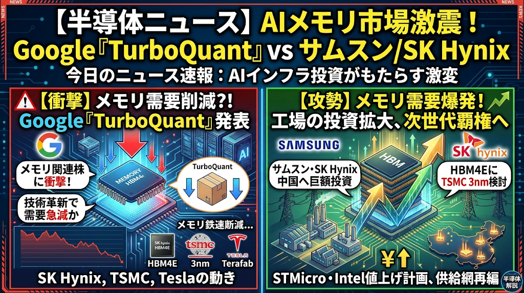 今日の半導体ニュースでは、AIインフラの投資拡大と技術革新がもたらす市場の劇的な変化が浮き彫りになっています。Googleが発表した新技術「TurboQuant」がメモリ需要を大幅に削減する可能性を示し、過熱していたメモリ関連株に強い衝撃を与えています。一方で、SamsungやSK Hynixはメモリ需要急増を見据えて中国での工場投資を拡大し、SK Hynixは次世代HBM4EにTSMCの3nmプロセスを検討するなど、次世代覇権に向けた動きも活発です。また、STMicroやIntelなどによる大規模な値上げ計画や、テスラの半導体工場「Terafab」の戦略的配置など、供給網の再編とインフレ圧力も業界全体の大きな関心事となっています。