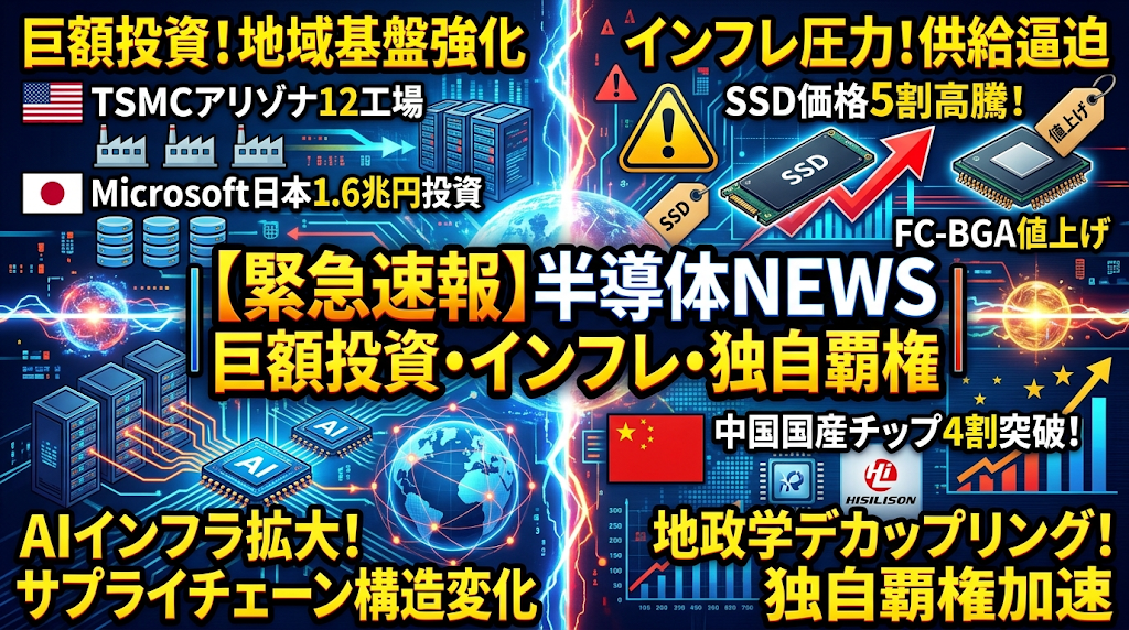 今日の半導体ニュースは、AIインフラの急速な拡大を背景に、世界規模での巨額投資とサプライチェーンの構造変化が鮮明に交錯する動きをお伝えします。TSMCの米国アリゾナ州での12工場建設計画や、Microsoftによる日本国内データ拠点への1.6兆円投資など、特定の地域における製造およびデータ基盤の強化が急ピッチで進められています。一方で、SSD価格の5割高騰やサムスン電機によるFC-BGA基板の値上げが示す通り、部材の供給逼迫による強烈なインフレ圧力が顕在化しています。さらに、中国市場での国産AIチップのシェアが4割を突破するなど、地政学的なデカップリングによる独自の技術覇権の移行も加速しています。