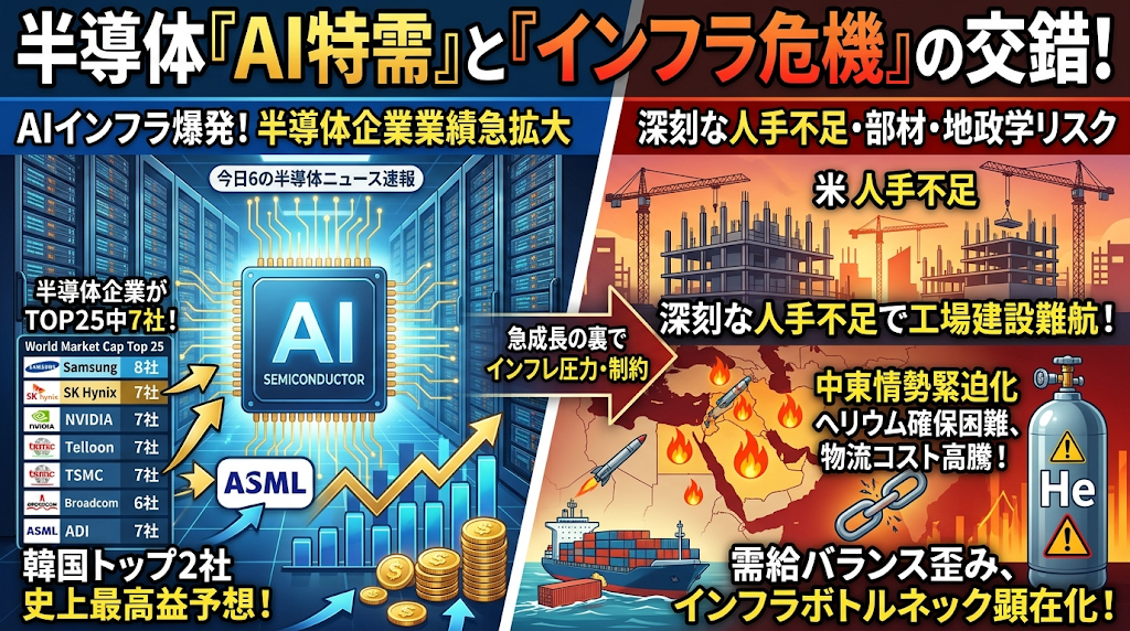 今日の半導体ニュースは、AIインフラの需要急増やそれに伴う企業の業績拡大と、サプライチェーンを取り巻く地政学的・物理的なリスクが交錯する状況をお伝えします。世界時価総額ランキングで半導体企業がトップ25のうち7社を占めるなど、AI投資が業界を力強く牽引しています。韓国の半導体トップ2社が史上最高の利益を予想する一方で、米国では深刻な人手不足により工場建設が難航し、中東情勢の緊迫化はヘリウムなどの部材確保や物流コストに強いインフレ圧力をもたらしています。急激な成長の裏で需給バランスの極端な歪みやインフラのボトルネックが顕在化しており、企業は新たな成長戦略と防衛策の双方を迫られています。