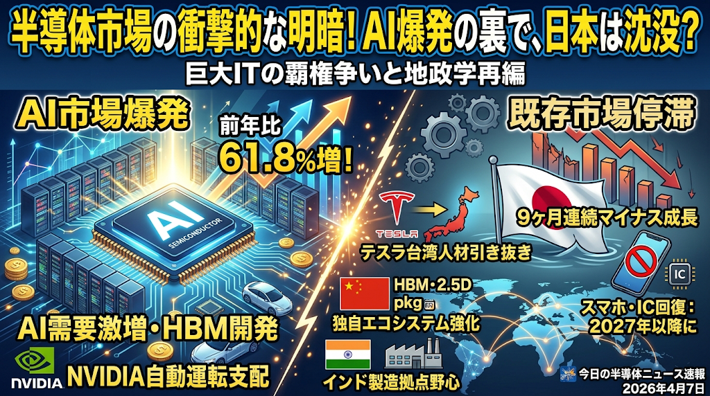 今日の半導体ニュースは、AIを軸とした成長分野と、既存市場の停滞という明暗がくっきりと分かれる動向をお伝えします。世界半導体市場が前年比61.8パーセント増と劇的な回復を見せる中、日本のみが9か月連続のマイナス成長に沈む厳しい現実が浮き彫りになりました。スマートフォン向けICの回復が2027年まで後ずれする一方、NVIDIAによる自動運転の支配や、テスラによる台湾での人材引き抜きなど、巨大IT企業の半導体内製化と覇権争いが激化しています。また、中国がHBM開発や2.5Dパッケージング投資で独自のエコシステムを強化し、インドが新たな製造拠点として野心をむき出しにするなど、地政学的なサプライチェーンの再編がますます加速しています。