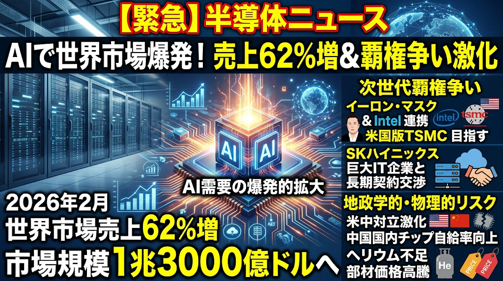 今日の半導体ニュースは、AI需要の爆発的な拡大を背景に、世界的な市場の成長とサプライチェーンの再編が激しく進行している状況をお伝えします。2026年2月の世界半導体売上高が前年同月比62%増と驚異的な伸びを示し、市場規模は1兆3000億ドルへ向かうとの予測が発表されました。こうした中、イーロン・マスク氏とIntelが連携し米国版TSMCを目指す動きや、SKハイニックスによる巨大IT企業との長期契約交渉など、次世代の覇権を巡る動きが活発化しています。一方で、米中対立の激化による中国国内でのチップ自給率向上や、ヘリウム不足・部材価格の高騰など、急成長の足元を揺るがす地政学的・物理的リスクも顕在化しています。