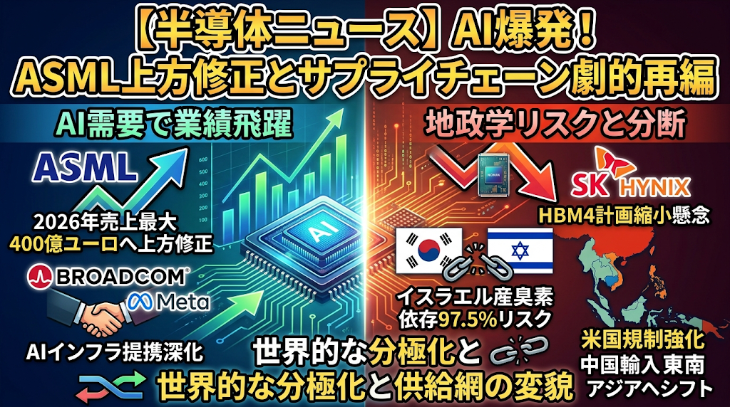 今日の半導体ニュースは、AIインフラ需要による業績の飛躍と、地政学的な分断に伴うサプライチェーンの劇的な再編が同時に進行する状況をお伝えします。ASMLが旺盛なAI需要を背景に2026年の売上予想を最大400億ユーロへと上方修正したほか、BroadcomとMetaがマルチギガワット規模のAIインフラ構築に向けて提携を深化させています。一方で、SKハイニックスのHBM4出荷計画の縮小懸念や、韓国のイスラエル産臭素に対する97.5パーセント依存のリスクなど、成長の足元を揺るがす不確実性も顕在化しています。さらに、米国の輸出規制強化により中国のチップ装置輸入が東南アジアへ大きくシフトするなど、世界の供給網は複雑に分極化しながら新たな形へと変貌を遂げています。