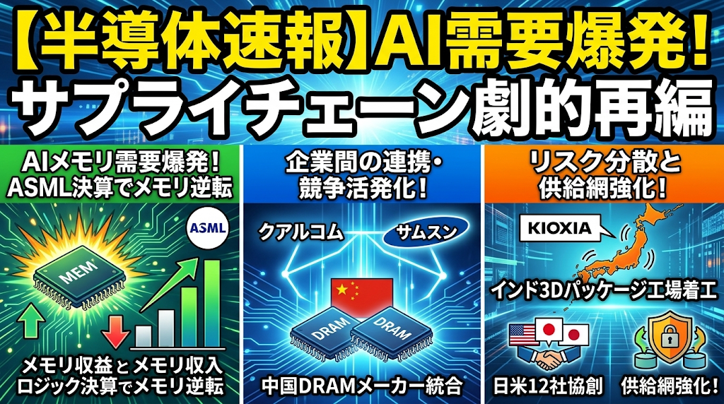 今日の半導体ニュースは、AI需要の急拡大が市場を牽引し、サプライチェーンの劇的な再編と次世代技術の開発競争が世界規模で同時進行している状況をお伝えします。AI向けメモリ需要の爆発的増加により、ASMLの第1四半期決算でメモリ向け収益がロジック部門を上回る逆転現象が起きました。また、クアルコムがサムスンの2nm技術採用を検討し、中国ではDRAMメーカー間の統合が進むなど、企業間の合従連衡が活発化しています。一方で、日本における巨大地震がキオクシアなどの供給網に与える影響が注視され、インドでの3Dパッケージ工場着工や日米12社による協創など、リスク分散とエコシステム強化の動きが顕著になっています。