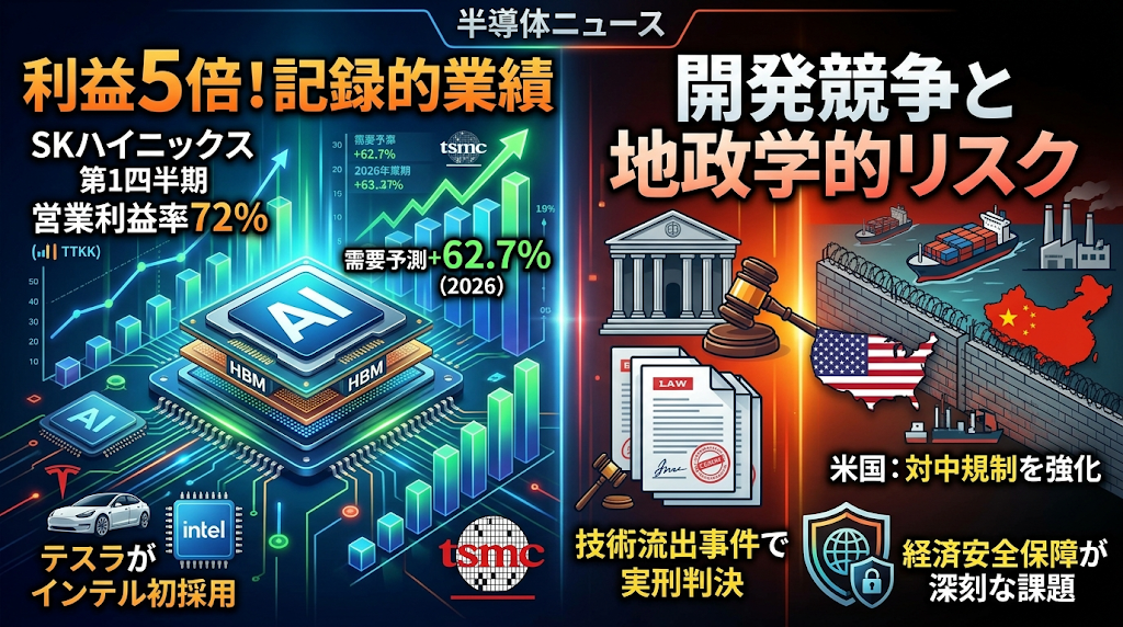 今日の半導体ニュースは、AIインフラの熱狂的な需要がもたらす記録的な企業業績と、次世代覇権を巡る激しい開発競争をお伝えします。 SKハイニックスの第1四半期利益が5倍に急増して営業利益率72パーセントを叩き出し、Omdiaが2026年の需要予測を62.7パーセント増に引き上げるなど、市場の成長は驚異的なスピードで進んでいます。 各社は次世代技術へ巨額の投資を行っており、テスラがインテルの14Aプロセスを初採用し、TSMCが2029年に米国でパッケージング施設を開設する計画を打ち出しました。 一方で、技術流出事件の実刑判決や米国の対中輸出規制強化を巡る動きなど、経済安全保障と地政学的リスクが業界の基盤を揺るがす深刻な課題として並行して進行しています。