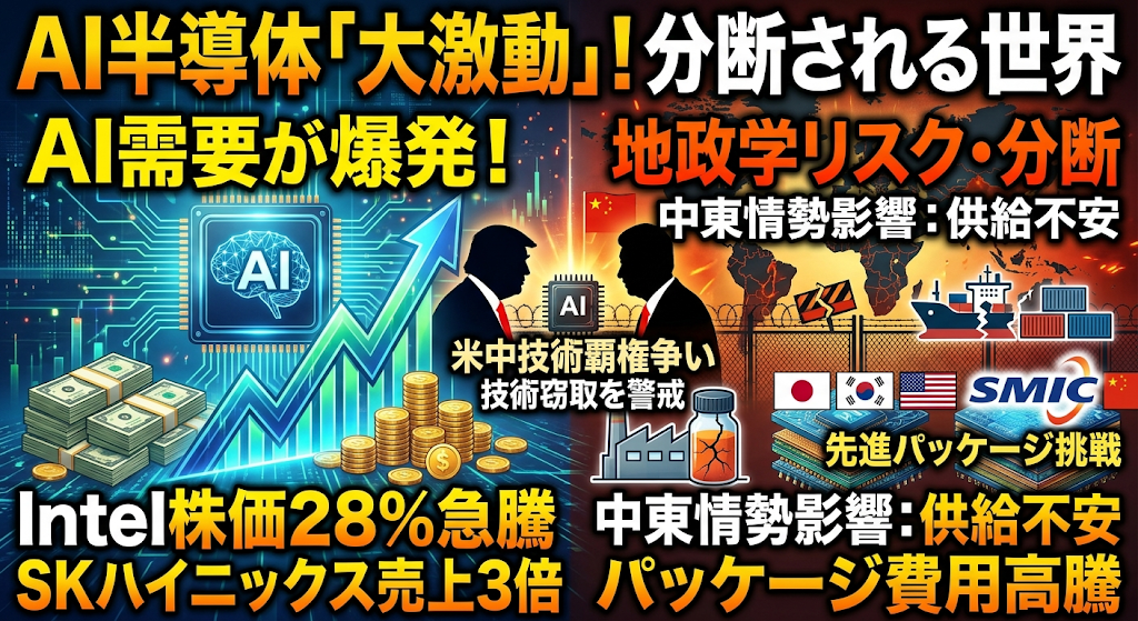 今日の半導体ニュースは、AI需要が牽引する驚異的な企業業績と、地政学リスクに伴うサプライチェーンの分断および再編の動きが交錯する状況をお伝えします。Intelの株価が28パーセント急騰し、SKハイニックスの売上が3倍に拡大するなど、AIインフラ投資が市場に莫大な利益をもたらしています。一方で、中東情勢の混乱による日本のフォトレジスト供給不安や、高度なパッケージング費用の高騰など、成長を阻害しかねない物理的・コスト的な制約も顕在化しています。さらに、トランプ政権による中国のAI技術窃取への警戒強化や、SMICの先進パッケージング再挑戦など、米中技術覇権を巡る対立とエコシステムのブロック化が一段と加速しています。