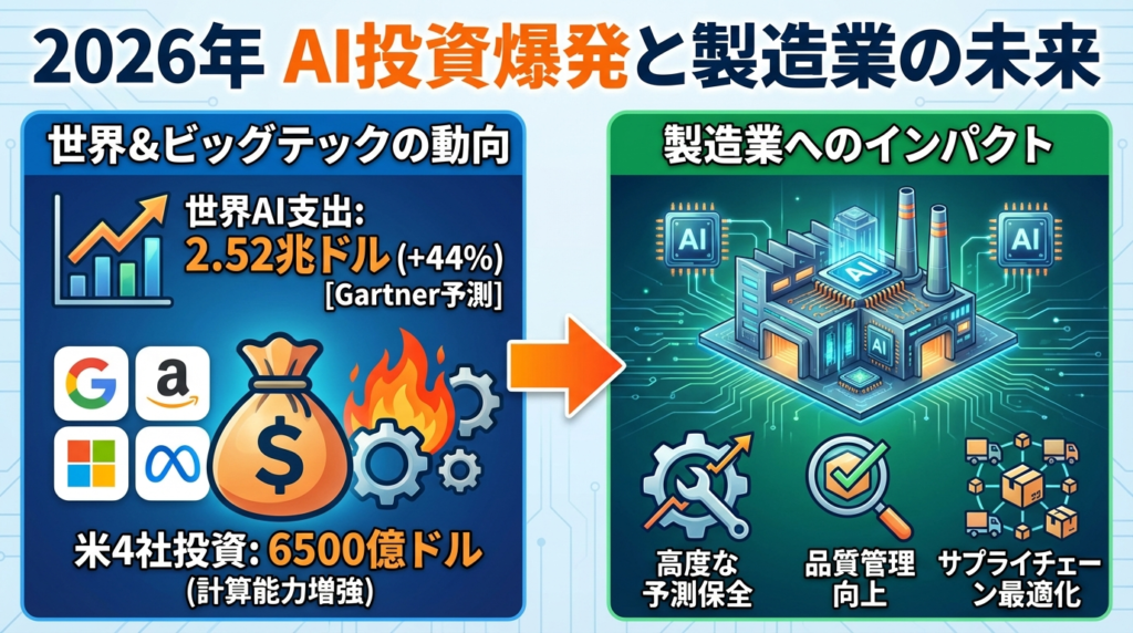 2026年のAI関連支出は、Gartner社の予測によると世界全体で2.52兆ドル(約370兆円)に達し、前年比44%増という驚異的な成長が見込まれています。特に注目すべきは、米国のビッグテックがこの一週間に発表した巨額の投資計画です。