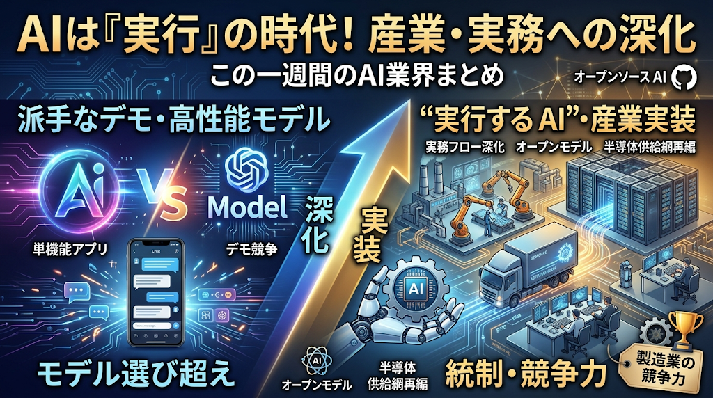 この一週間のAI業界は、単なる「高性能モデル競争」から一歩進み、資金・計算資源・業務実装・産業インフラをどう結び付けるかが問われる局面に入りました。大手各社は、派手なデモや単機能アプリよりも、企業内の実務フローに深く入り込む“実行するAI”へと軸足を移しつつあります。同時に、オープンモデルの拡大、半導体供給網の再編、工場や物流を含む物理空間へのAI展開も加速しました。製造業にとっては、AIを「使うかどうか」の段階を超え、どの領域で、どのモデルを、どの統制の下で使い分けるかが競争力を左右する週だったと言えます。