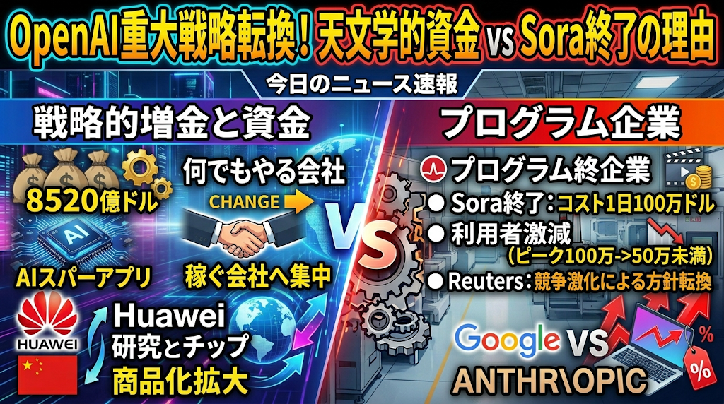 OpenAIは3月31日、1220億ドルの資金調達を完了し、ポストマネー評価額8520億ドルと発表しました。資金は研究、製品、計算資源の拡張に振り向けられ、ChatGPT、Codex、ブラウジング、各種エージェント機能を束ねた「AIスーパーアプリ」構想も打ち出しています。一方でReutersは、GoogleやAnthropicとの競争激化を受け、OpenAIがリソース配分を見直し、コーディングや企業向けツールへ重点を移していると報じました。TechCrunchによれば、Soraはピーク時約100万人から50万人未満へ利用者が減少し、1日約100万ドルのコストを消費していたため、終了判断に至ったとされます。つまり今週のOpenAIは、「何でもやる会社」から「収益化しやすい業務領域に集中する会社」へと色合いを強めました。 OpenAI Reuters TechCrunch