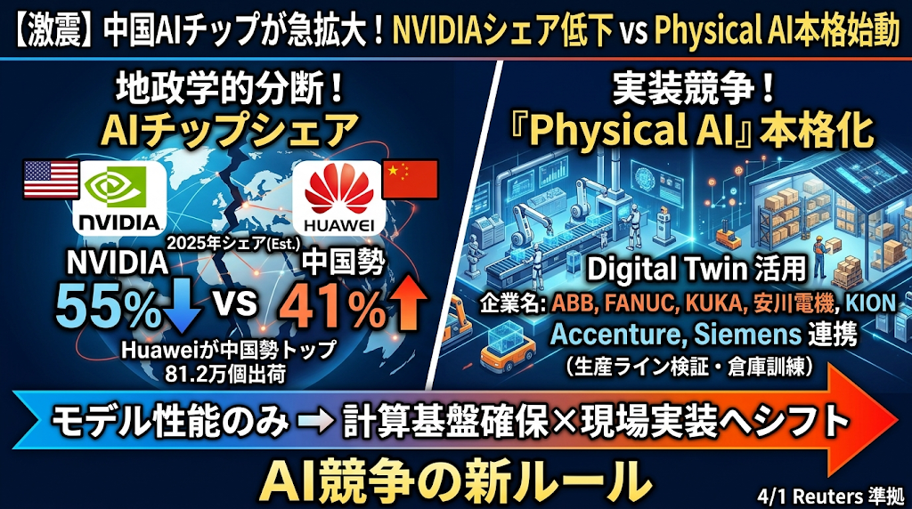 4月1日付Reutersによると、中国のGPU・AIチップ企業は2025年の中国AIアクセラレータサーバー市場で41%のシェアを確保し、NVIDIAは依然首位ながら55%まで低下しました。Huaweiは中国勢トップで約81.2万個を出荷したとされ、AI半導体の地政学的分断が一段と進んでいます。これと並行してNVIDIAは、GTC 2026を受けた発信で、ロボット、車両、工場が単発導入からエンタープライズ規模の“Physical AI”へ移行していると強調しました。ABB、FANUC、KUKA、安川電機がデジタルツインで生産ライン検証を進め、KIONはAccenture、Siemensと組んで自律フォークリフト訓練用の倉庫デジタルツインを構築しています。AIの競争軸は、モデル性能だけでなく、どの計算基盤を確保し、現場へどう実装するかへ移っています。 Reuters NVIDIA Blog NVIDIA Blog