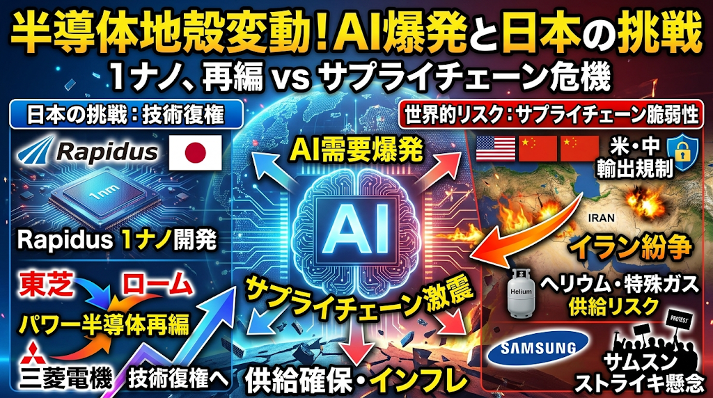 Today’s semiconductor news highlights a situation in which the global semiconductor supply chain is undergoing violent tectonic shifts against the backdrop of exploding demand for AI. The Japanese semiconductor industry is undergoing a restructuring and technology revival, as evidenced by talks among Toshiba, Rohm, and Mitsubishi Electric to integrate their power semiconductor businesses, and Rapidus’ progress in developing 1-nanometer technology. On the other hand, physical and geopolitical vulnerabilities that could hinder the industry’s speed of growth have emerged, such as the U.S. security law’s clampdown on exports to China, the supply risk of helium and other specialty gases due to the Iranian conflict, and concerns of a strike at Samsung Electronics, making supply security and inflation control urgent issues. The industry is facing pressing issues of supply security and inflation control.