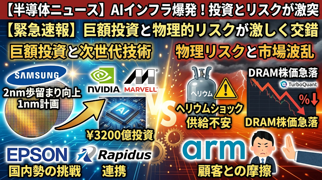 Today’s semiconductor news highlights the intersection of massive investment in next-generation technologies and physical risks in the supply chain as demand for AI infrastructure explodes. From Samsung’s 2-nanometer yield improvement and 1-nanometer plans to NVIDIA’s 320 billion yen investment in Marvell, technology development and capital investment for next-generation dominance is accelerating. At the same time, however, factors are emerging that are causing turbulence in the market’s growth trajectory, such as the “helium shock” supply uncertainty of key materials, the plunge in DRAM stock prices following the announcement of turbo quant technology, and friction with customers following Arm’s entry into the market with its own chips. New challenges by domestic players, such as the collaboration between Epson and Rapidus, are also attracting attention.