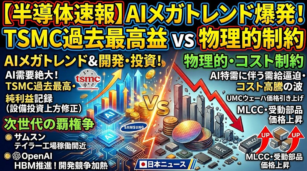 In today’s semiconductor news, we report on how the AI megatrend is having an enormous impact on corporate performance and the supply chain, with TSMC posting record sales and net income and revising its future capex plans upward, highlighting the resilience of AI demand. In addition, Samsung’s Taylor plant is nearing startup, and OpenAI’s HBM promotion has sparked a new development race for next-generation supremacy. On the other hand, as seen in UMC wafer price hikes and rising prices for passive components such as MLCCs, the tight supply-demand balance and soaring costs associated with special demand for AI are spreading throughout the industry, creating a market environment where growth and physical constraints intersect.